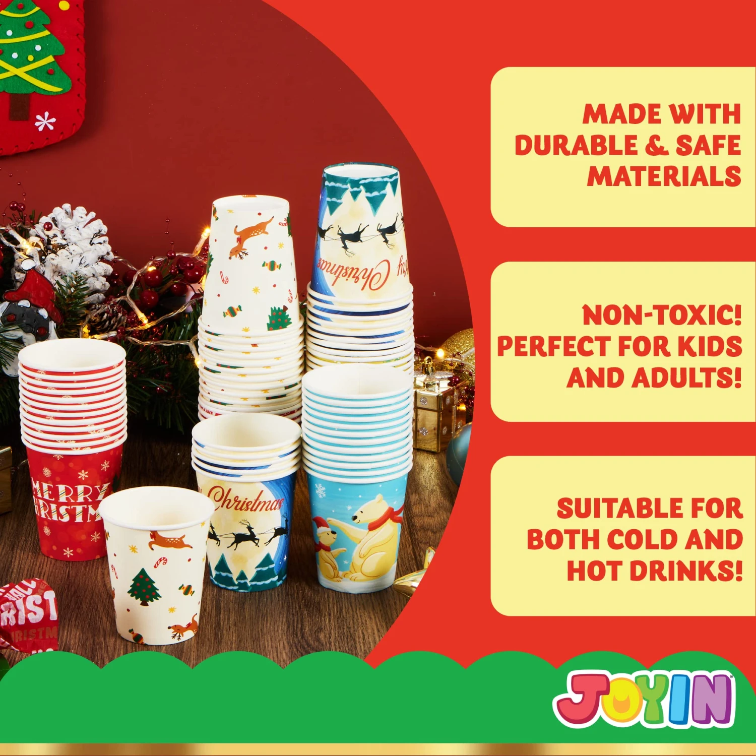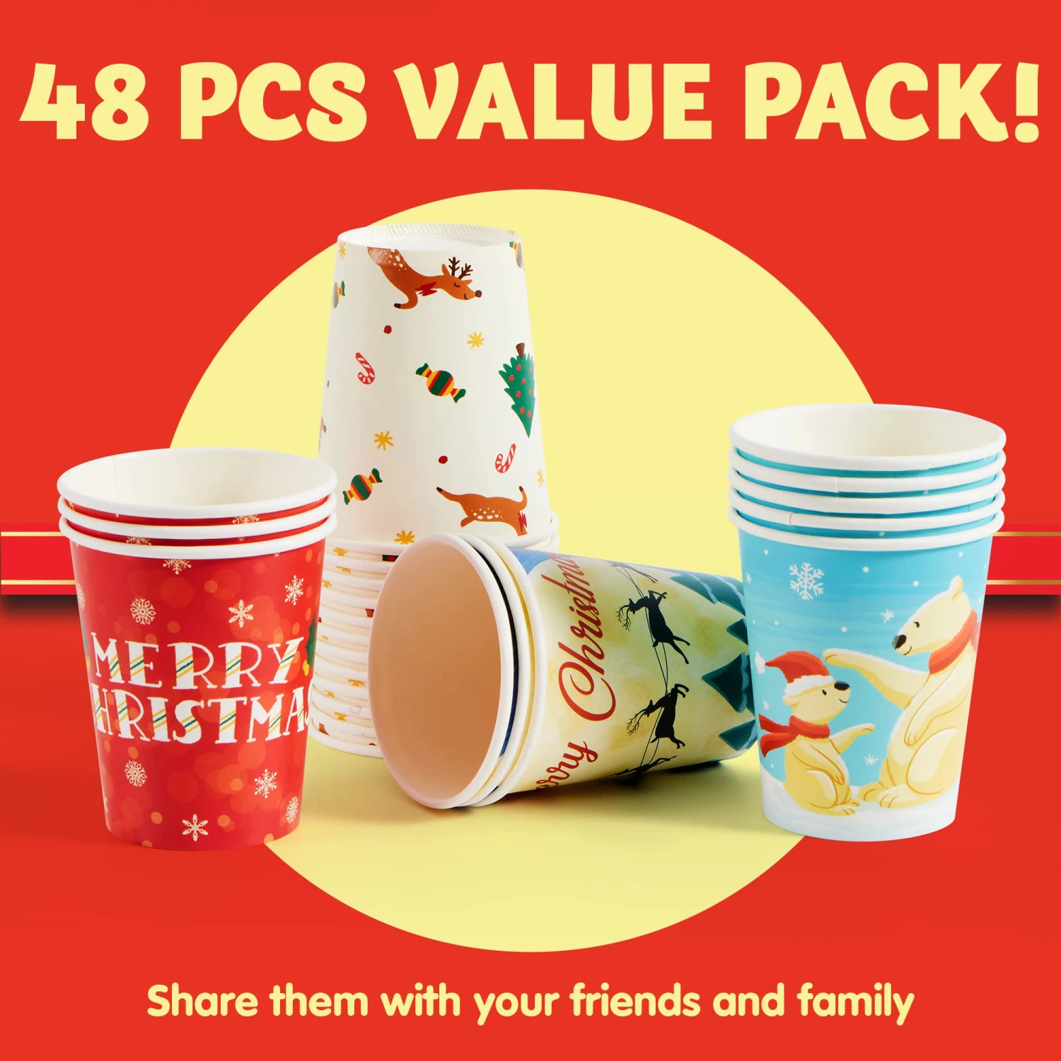 - Our Christmas Paper Cups Set includes 48 pieces of Christmas paper cups measuring 9 oz in 4 assorted Holiday designs.