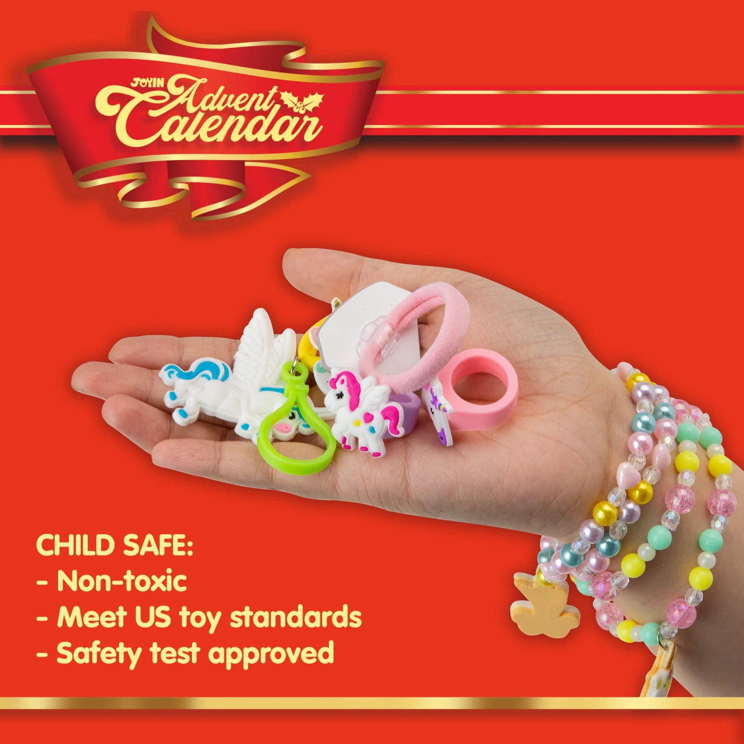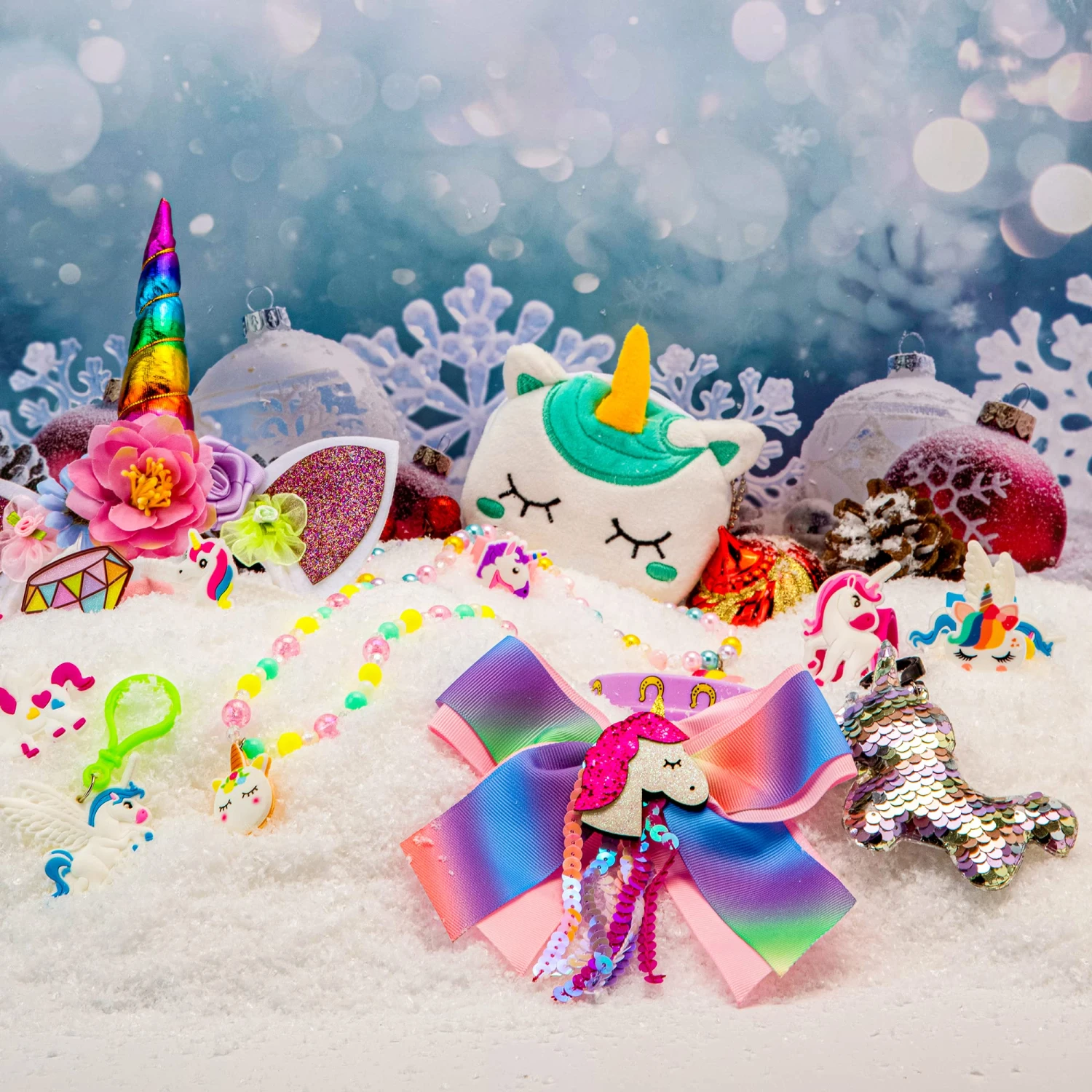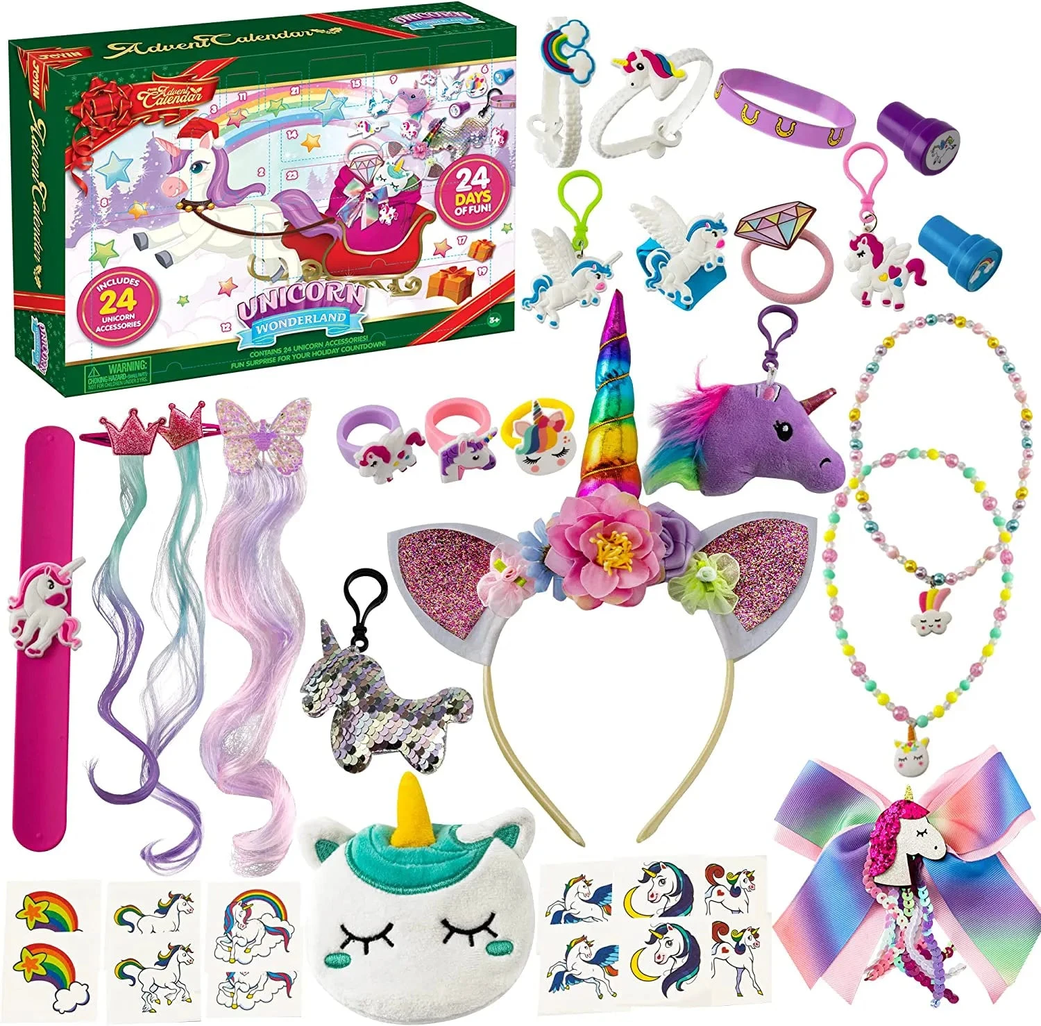 - Our advent calendar includes 24 days countdown a silicone wristband, a hairband, a hair bow, a unicorn sequin keychain, a coin purse, a unicorn plush, 2 stamps, 2 key chains, 2 bracelets, 24 tattoo stickers in 2 days, 2 rings, 2 hair clips, 2 hair scrunchies, 2 slap bracelets, and 2 necklaces.