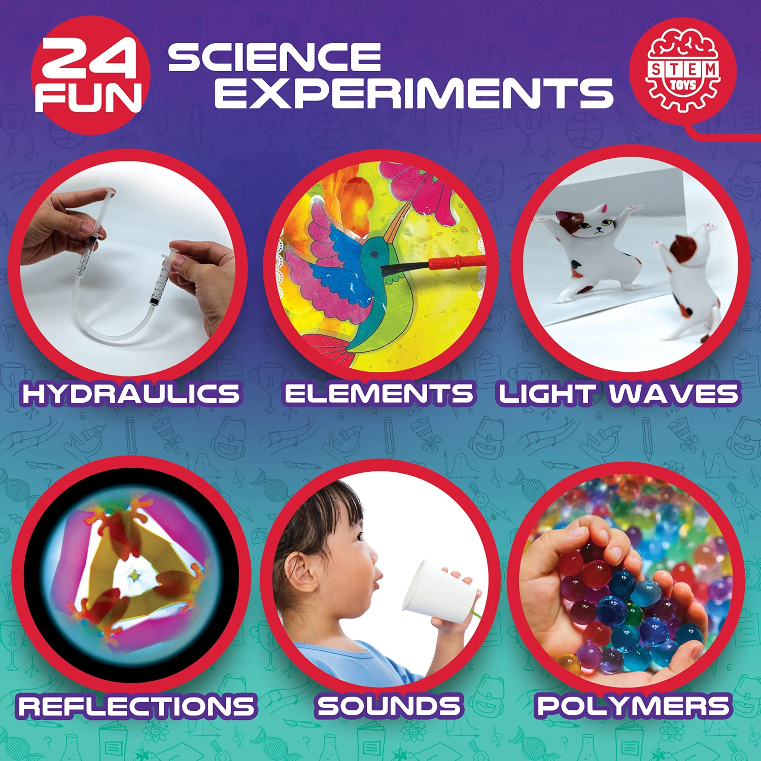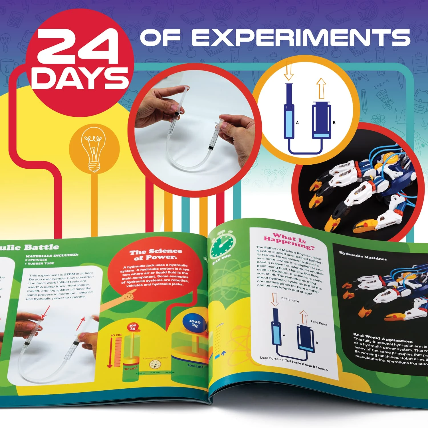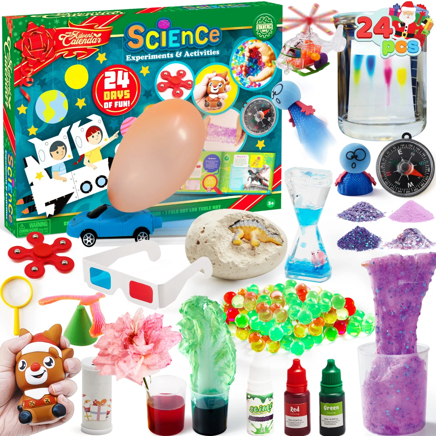 - Our 24 Days Christmas Advent Calendar withInvisible ink pen with light cap, Balancing eagle with stand, Lenticular Card, 3D Glasses, Windup helicopter, Liquid motion timer, Foam airplane set, Balloon power racing car, String telephone, Navigational compass, Distorting mirror, Non-newtonian fluid, Growing water beads, Chromatography, Water reveal, Magnifying glass, Magnet drawing board, Hydraulic battle, spinner, Jumping emoji push bubble, Kaleidoscope, Tangled metal wire puzzle, Stress release toy, Fossil dig.