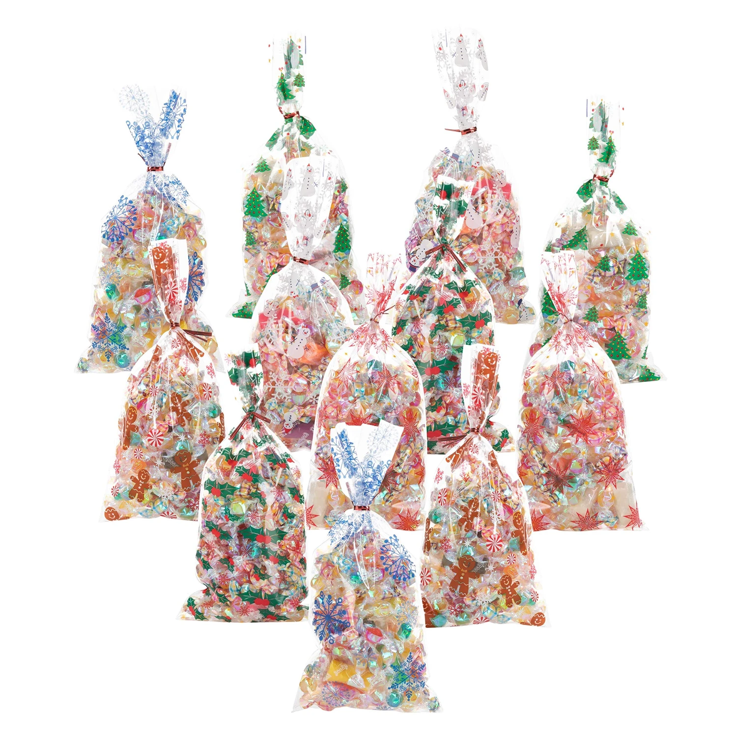 - These Christmas goody bags include 150 pieces per pack of high-quality holiday cellophane bags that measure 11*5. It also comes with 150 pcs twisted ties