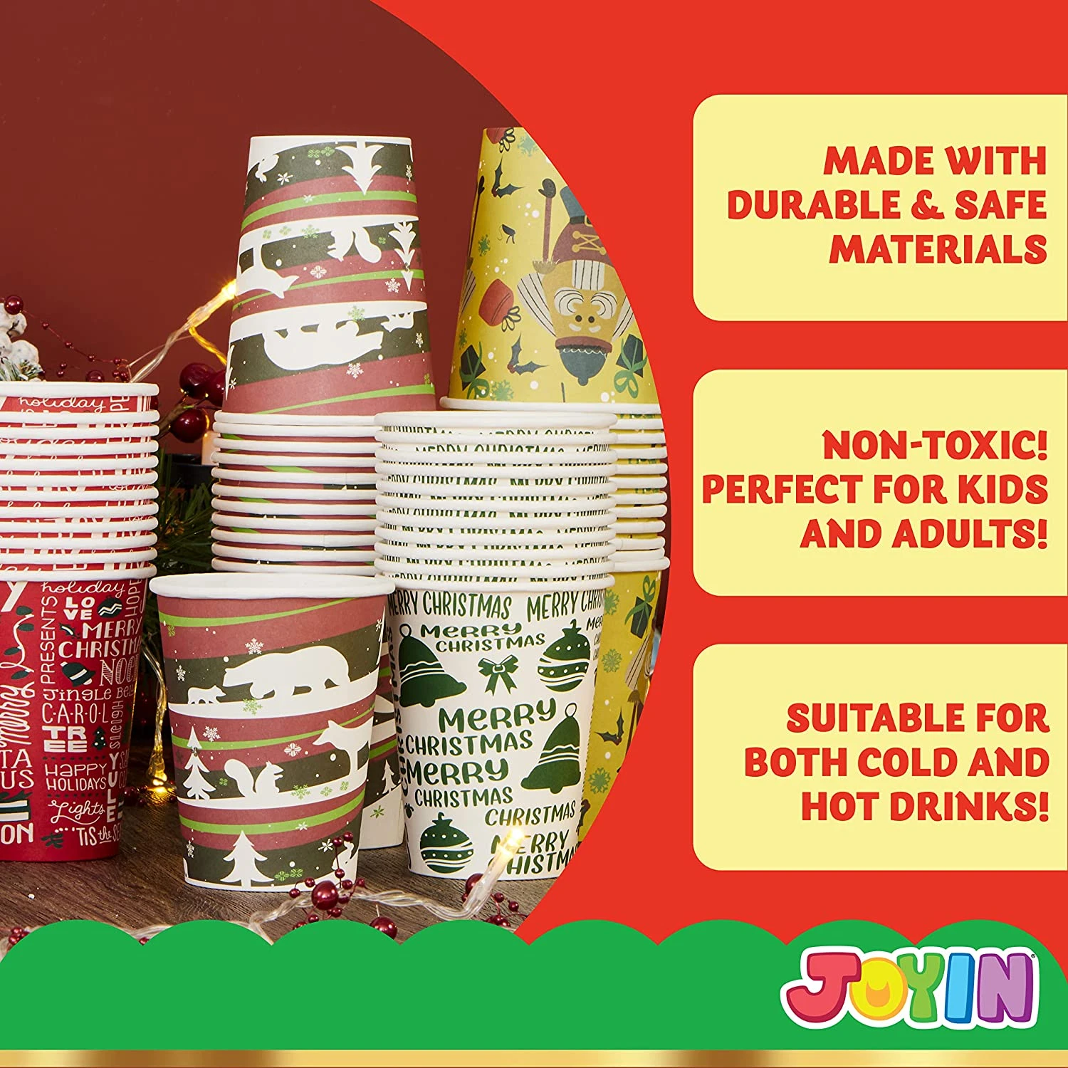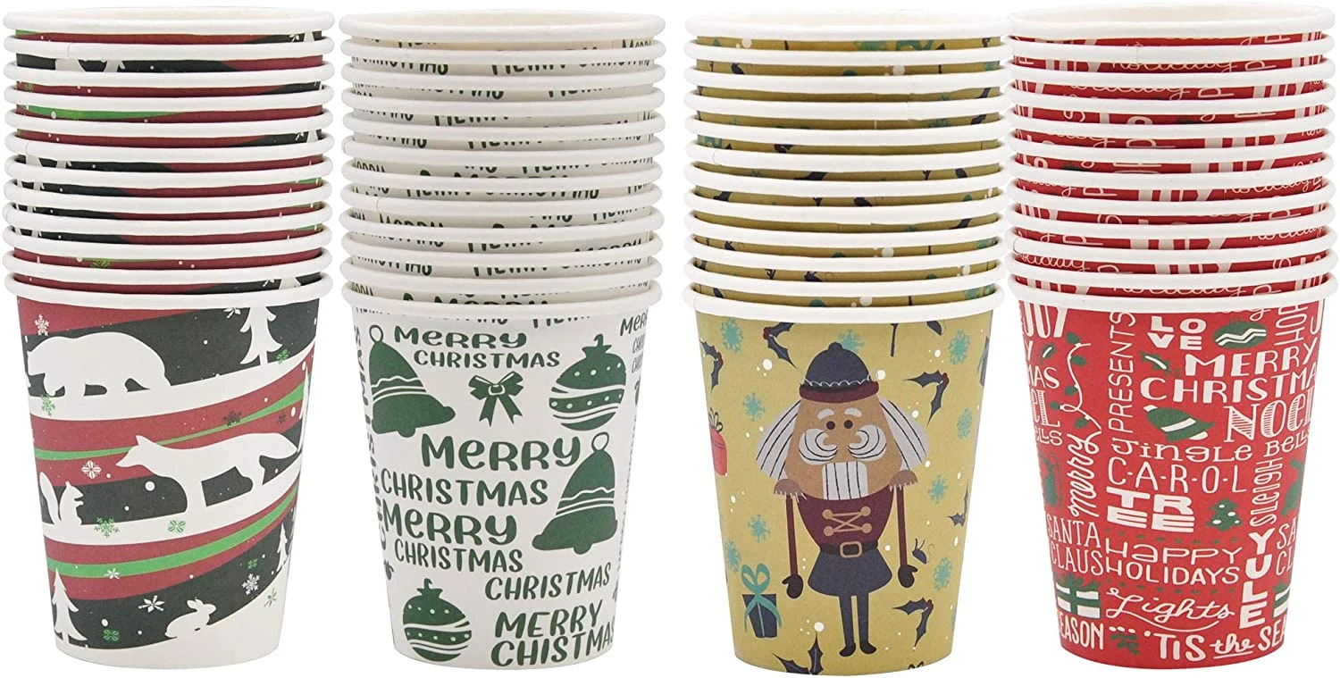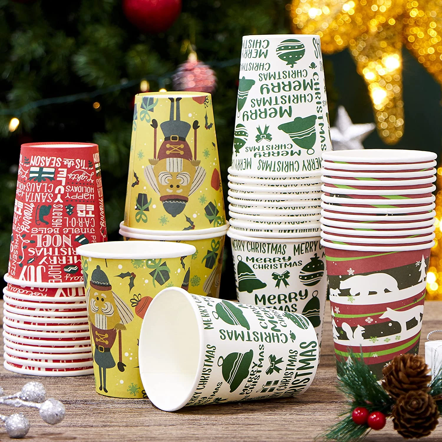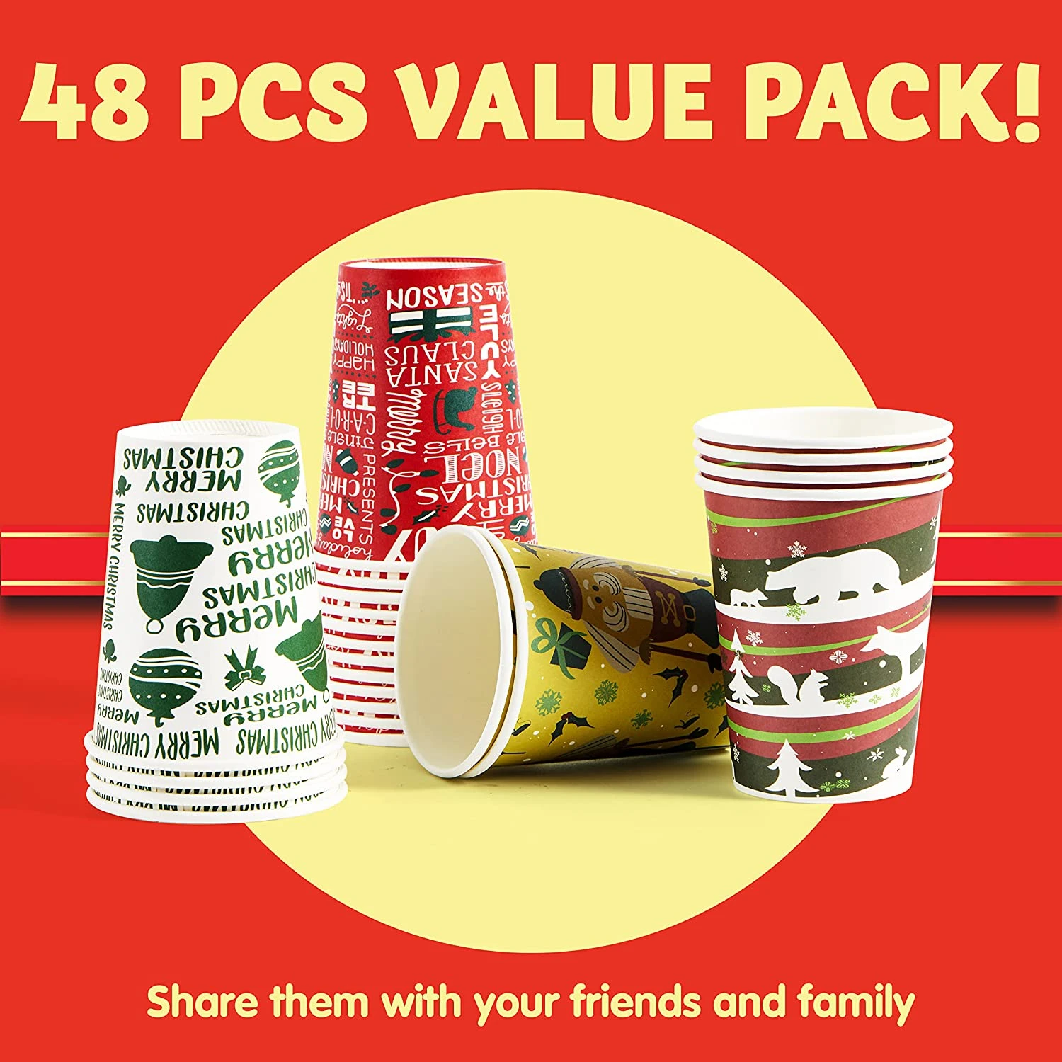 - Super value pack. Our high quality Christmas paper cup set includes 48 pieces with 4 unique designs. Each design consists of 12 cups, printed with merry Christmas, nutcracker, Christmas elements and holiday spirits. The paper cup measures 9 oz each.