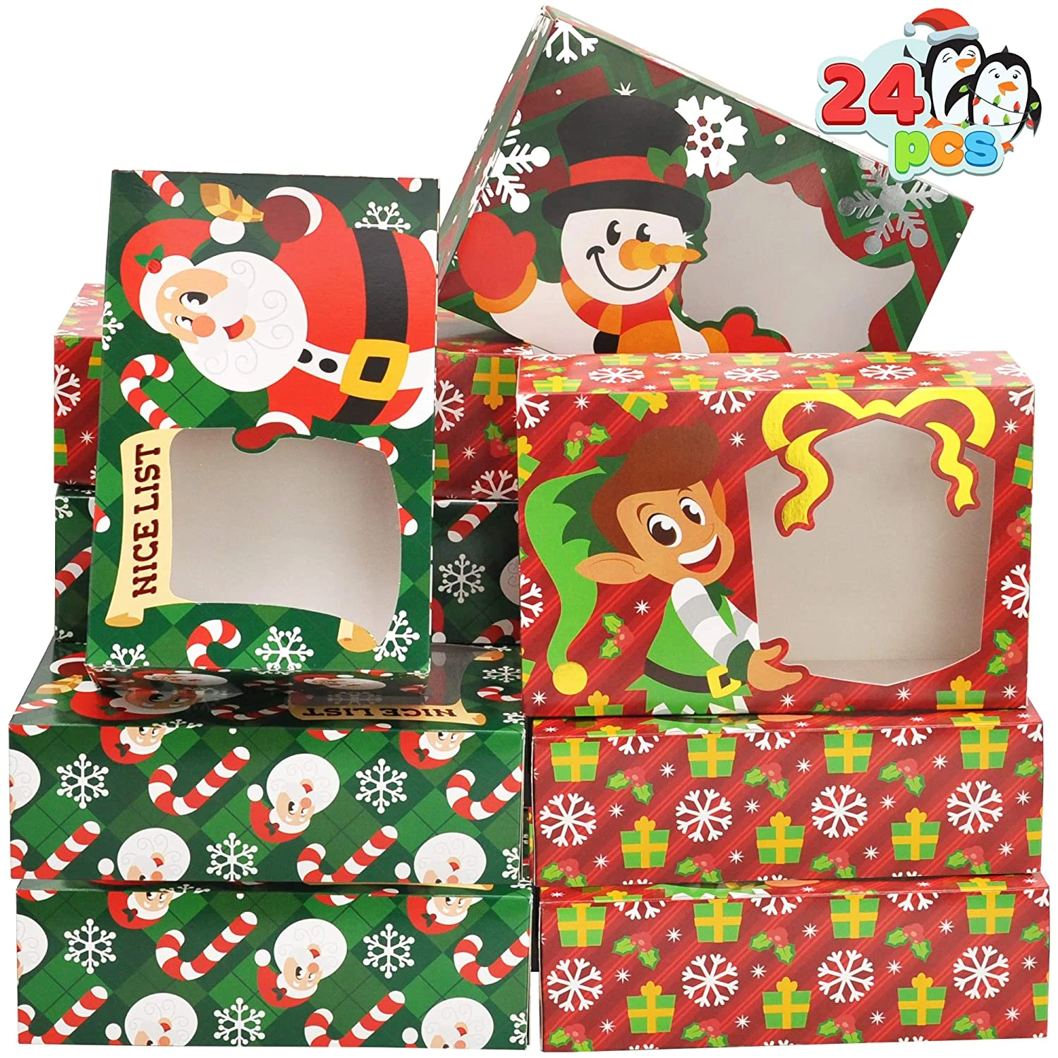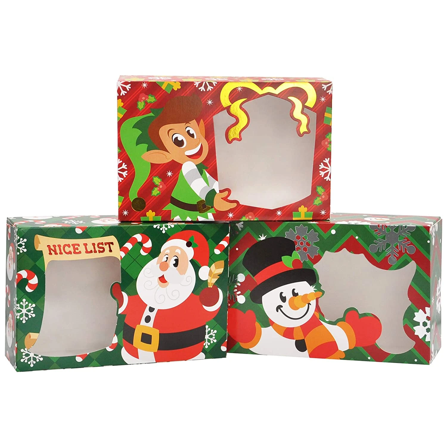 - Our holiday foil treat cookie boxes for gift-giving with window includes 24 pieces of cookie boxes in 3 different colors (green, red, and white). Each box measures 8.75″ x 5.75″ x 2.75″ inches. The unique design includes reindeer with a Christmas tree, Santa, and snowman!