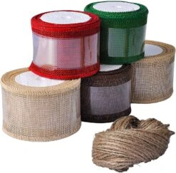 - Our christmas ribbon set includes 5 rolls of burlap ribbon with 100ft craft linen rope. Total 84 feet, 12ft dark red ribbon, 12ft dark green ribbon, 12ft dark brown ribbon, and 2 rolls of 24ft natural kraft paper color ribbon. Measuring 2.5 inches wide.