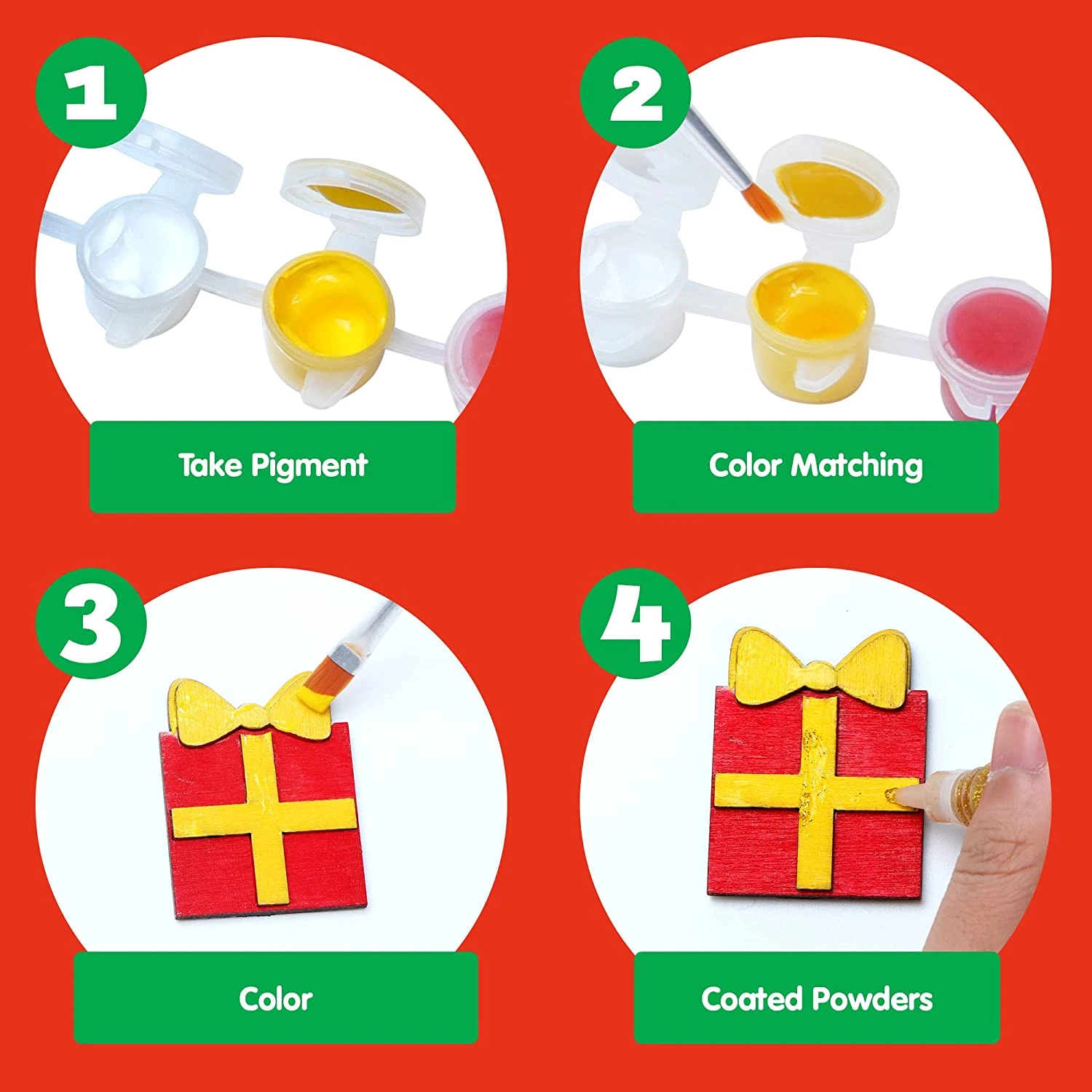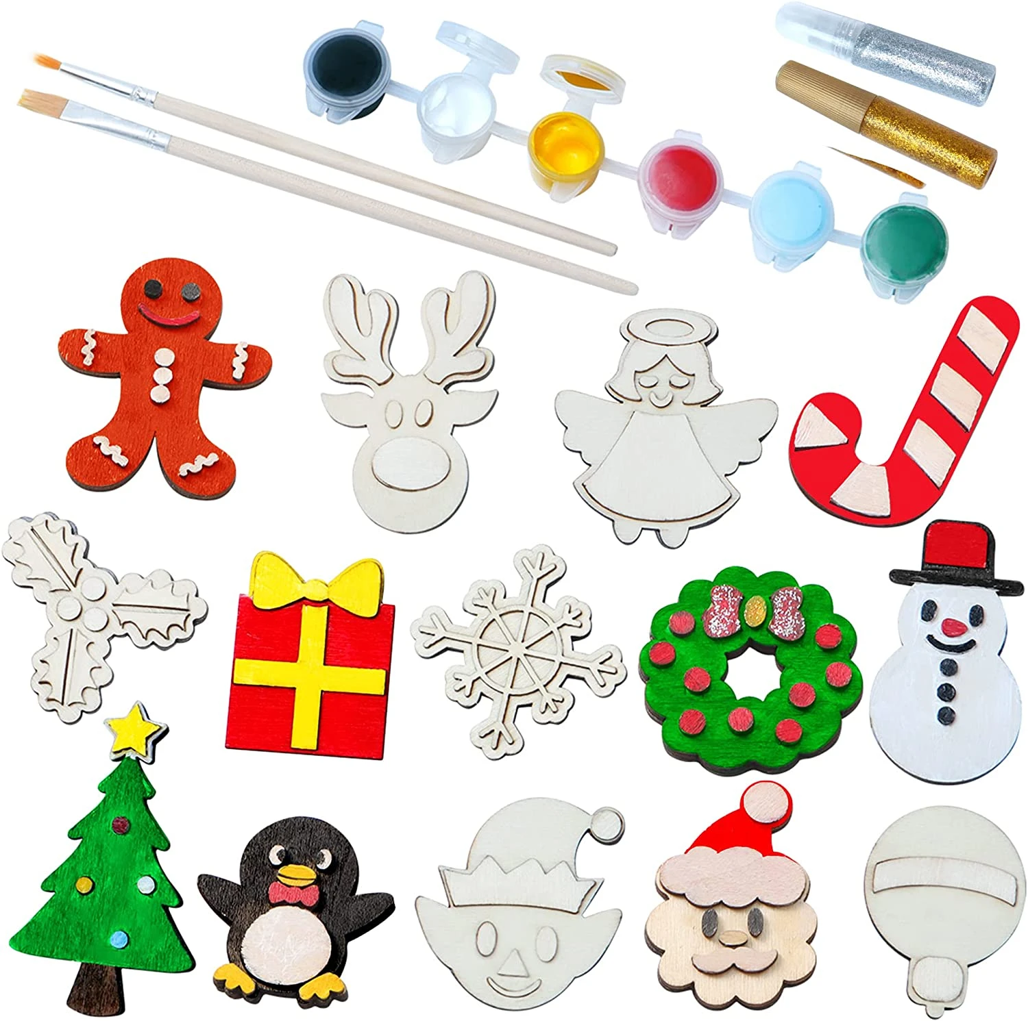 - Our DIY creativity art kit includes 14 wood magnets, 6 colors paint palette, 2 brushes,Β 2 glitter glue, and the instruction sheet.