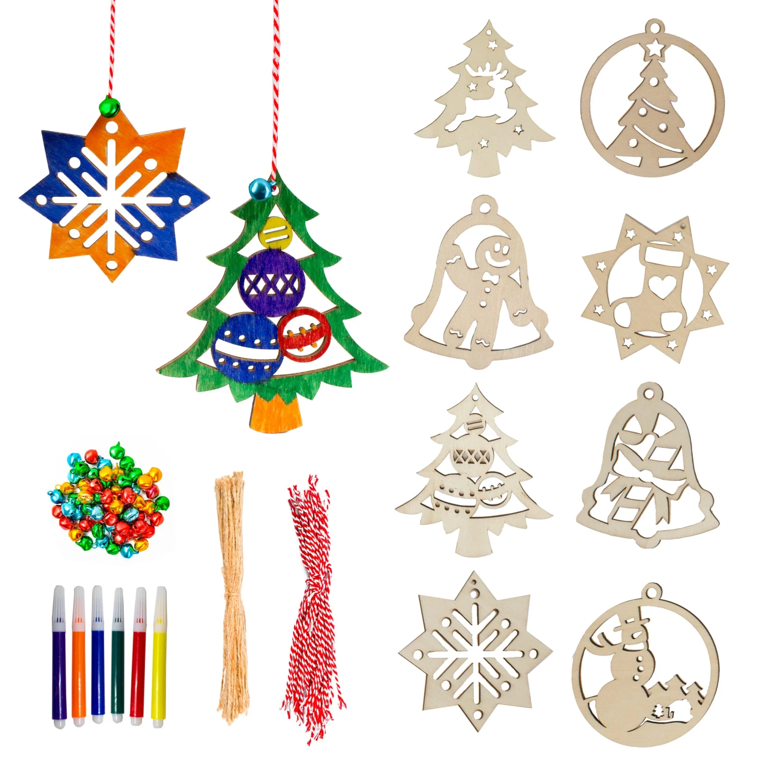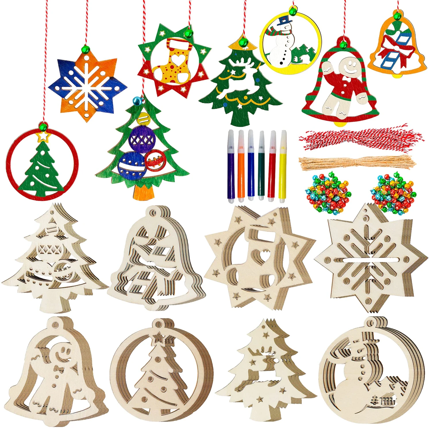 - Our Christmas wooden ornaments craft kit with color pens includes 48 pieces of plain wooden ornaments, comes with strings, red-white strings, bells and 6 colored markers. The plain wooden ornaments are made of sturdy, durable and eco-friendly wood, providing you with a better painting experience.