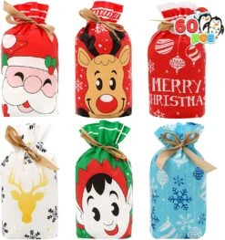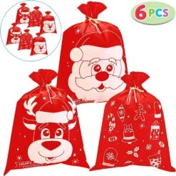 Small Christmas White & Red Themed Bag With Drawstring 8 Designs, 32 Pcs